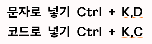 문자열로 입력하는 단축키는 Ctrl + K,D 코드로 입력하는 단축키는 Ctrl + K,C입니다.