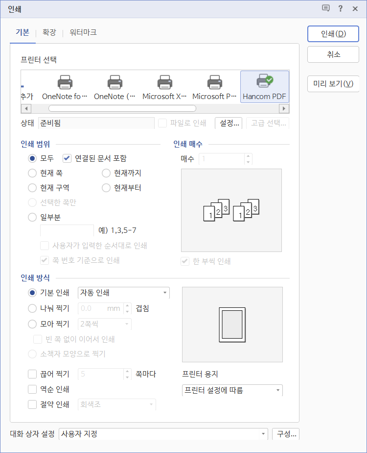 Hancom PDF와 같은 PDF를 선택하고 인쇄를 눌러주면 됩니다.