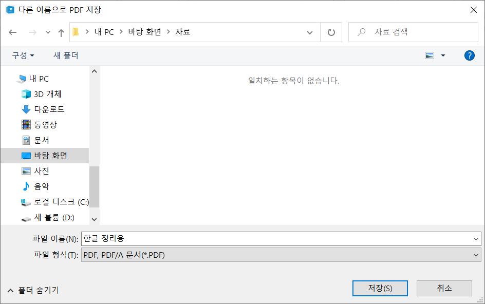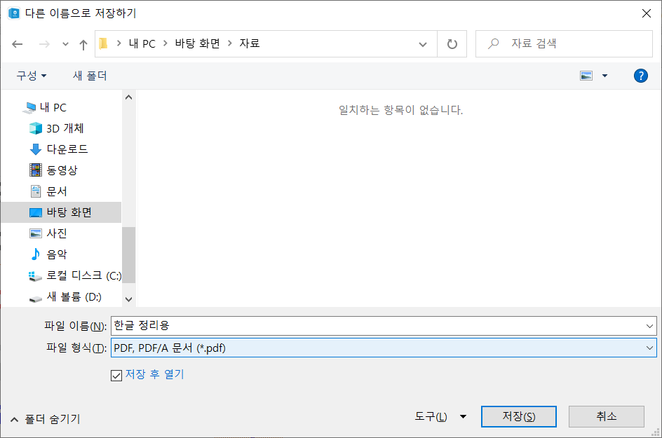파일의 이름과 저장 위치를 설정해주고 저장을 눌러주면 PDF 파일이 저장됩니다.